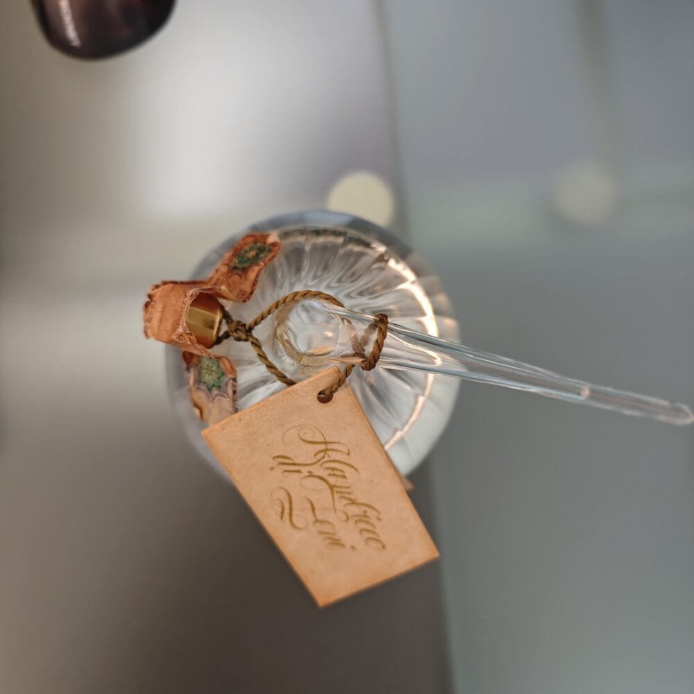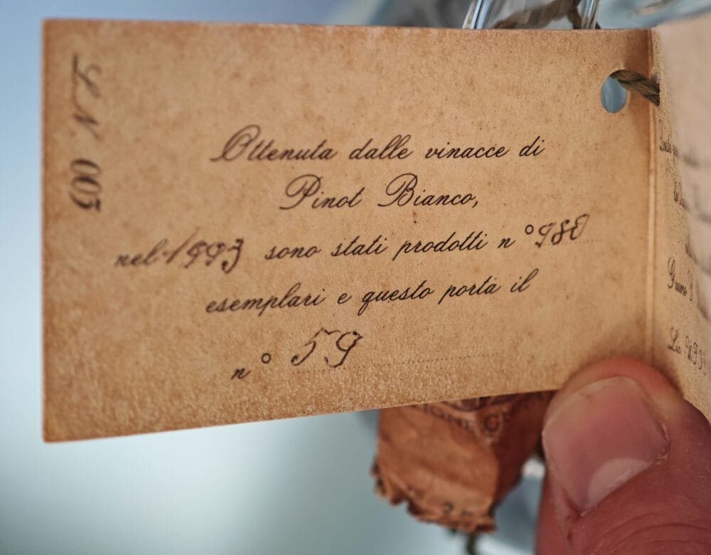 Si tratta di una grappa da vinacce di Pinot Blanc, prodotta dai fratelli Zeni nel ’93, come descritto nell’etichetta allegata. La bottiglia è numerata come n.59 su solo 980 totali. La peculiare forma ad alambicco della bottiglia da 500ml permette sia la frattura del “becco” terminale per il versamento del prodotto o un più classico tappo posteriore.